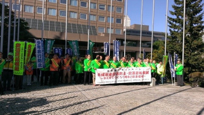 当協会北海道支部(樋渡支部長)は、9月26日、札幌市役所聖火台広場で開催された北海道小売酒販組合連合会主催の「未成年者飲酒防止・飲酒運転根絶」街頭キャンペーンに参加しました。このキャンペーンには昨年も参加しており、本年も主催者から北海道警察本部を通じて参加依頼があり実現したものです。このキャンペーンには札幌国税局・北海道警察本部・北海道交通安全協会など多数の行政機関・関係団体の参加があり、当協会北海道支部からは6名が参加しました。
