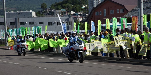 出動式は、各団体と町内会の参加者で人波をつくり、のぼり旗で『旗の波作戦』を展開、白バイ・パトカーが先導して各団体の車両が出動していきました。交通事故被害者にささげる献花式は、昨年7月13日に小樽銭函のおたるドリームビーチで起きた飲酒ひき逃げ事件の発生場所で行われ、樋渡支部長が献花しました。飲酒運転根絶に取り組んでいる協会の諸活動と、ジェイ・ディ共済主催の「SDD全国こども書道コンクール」が、小樽市や小樽警察署をはじめとする関係団体より高い評価を受けました。 |