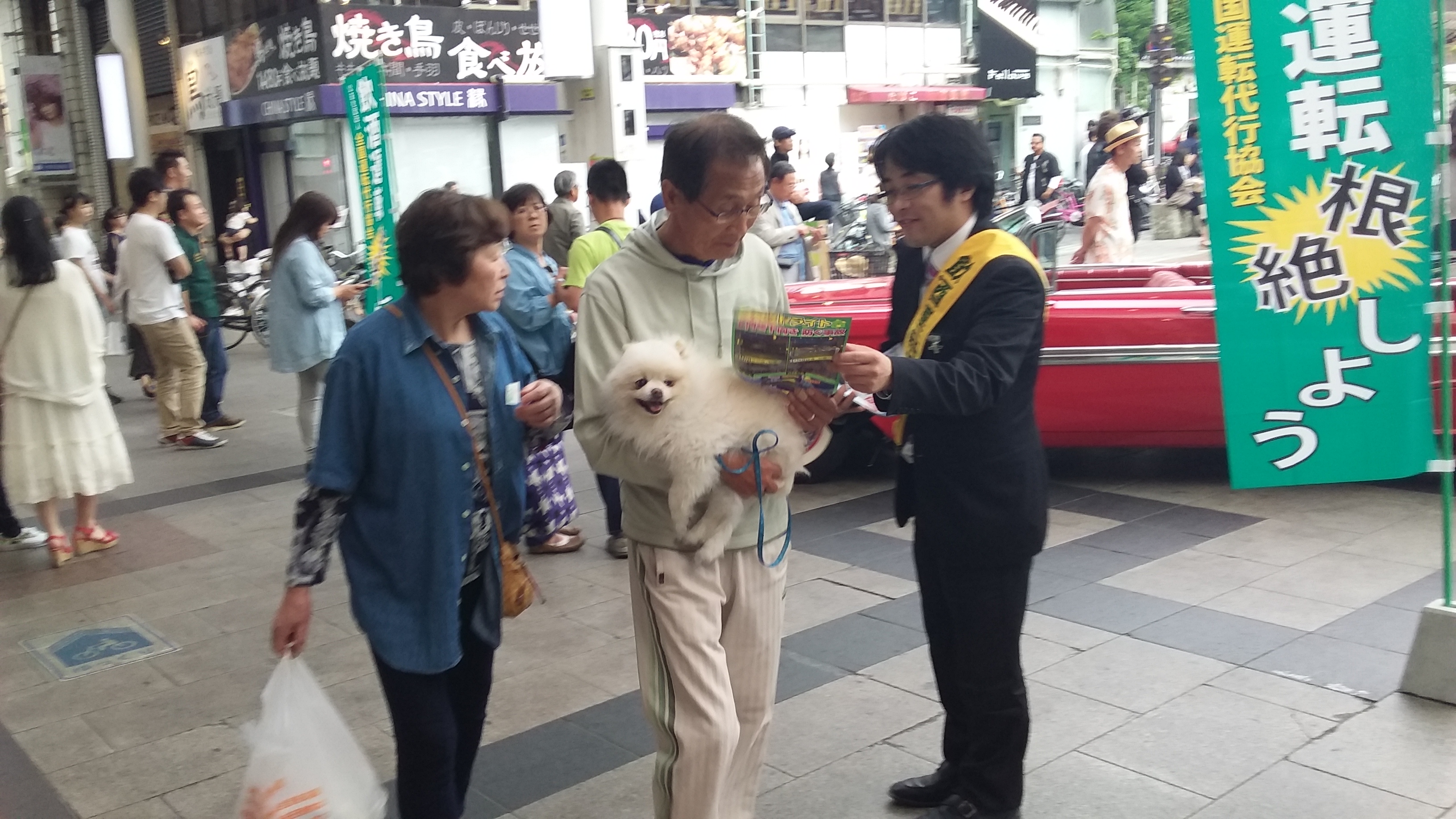 厚い催し会場を移動する市民に、スーツにネクタイ姿で飲酒運転根絶を訴える会員 |