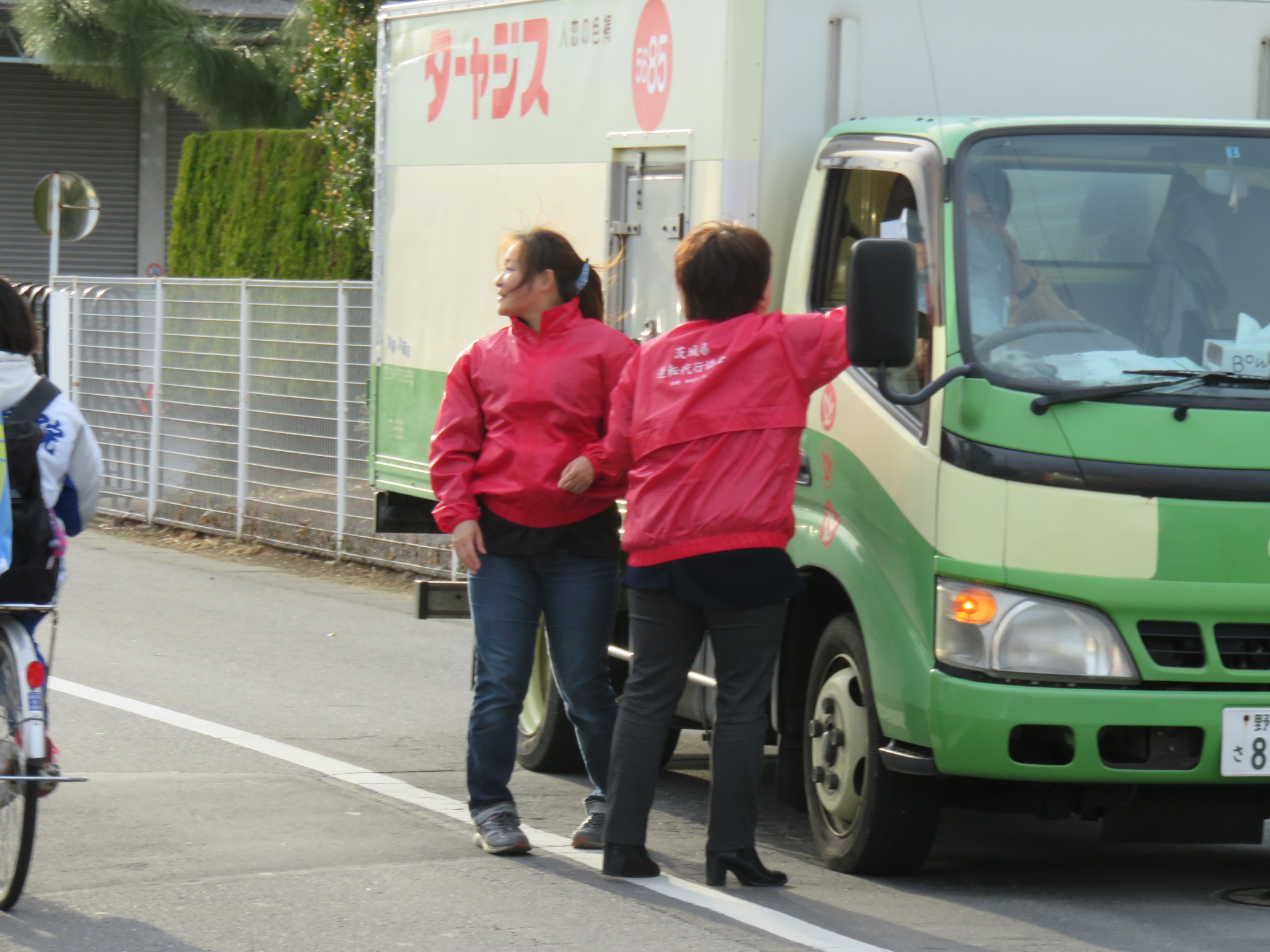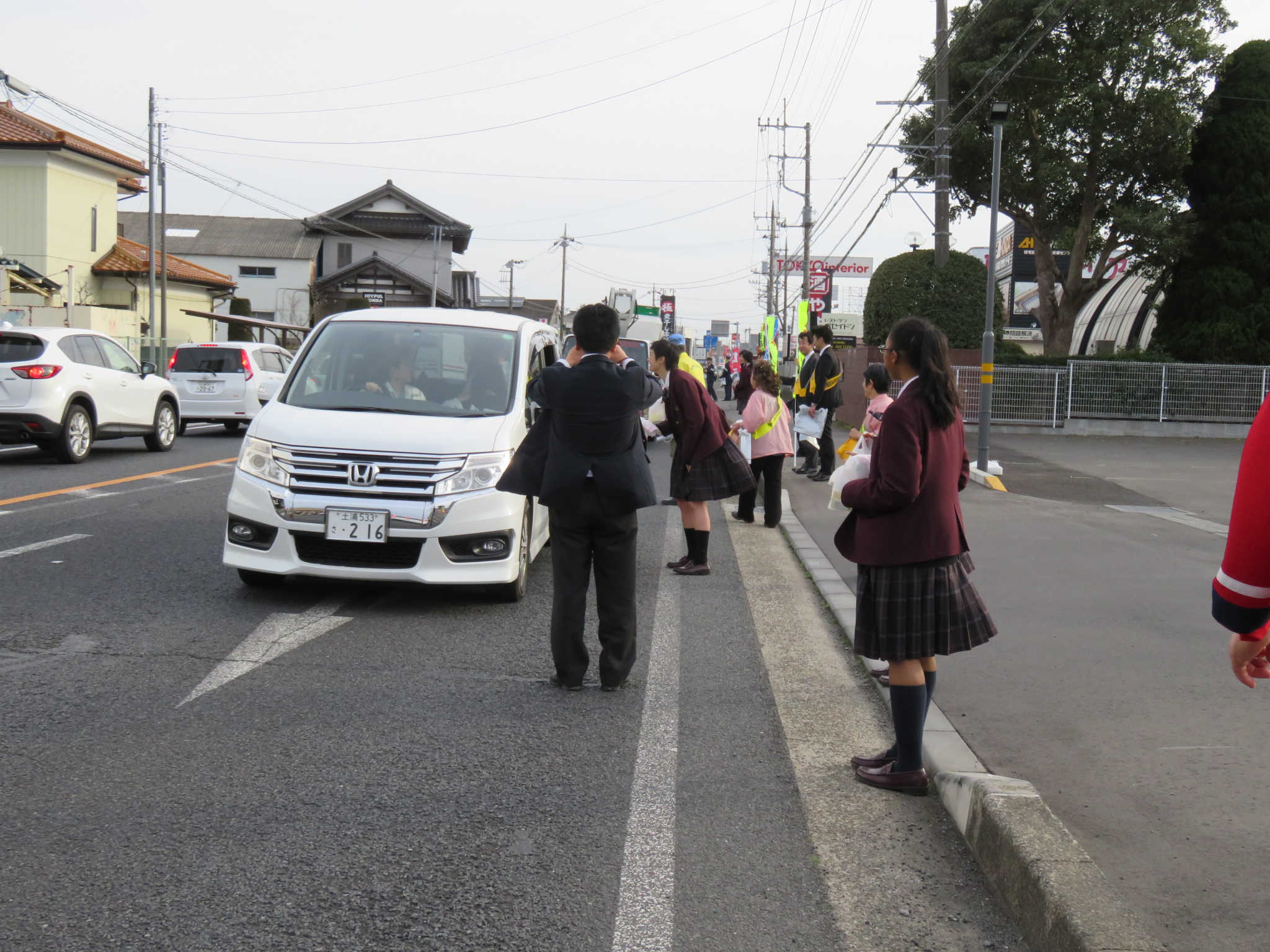 強風の中、関係団体の方々と国道6号線の沿道で通行の自動車に交通安全を呼びかけるほか、赤信号で停車した車等にキャンペーングッズを配布しながら、交通安全を運転手さんに呼びかけました。