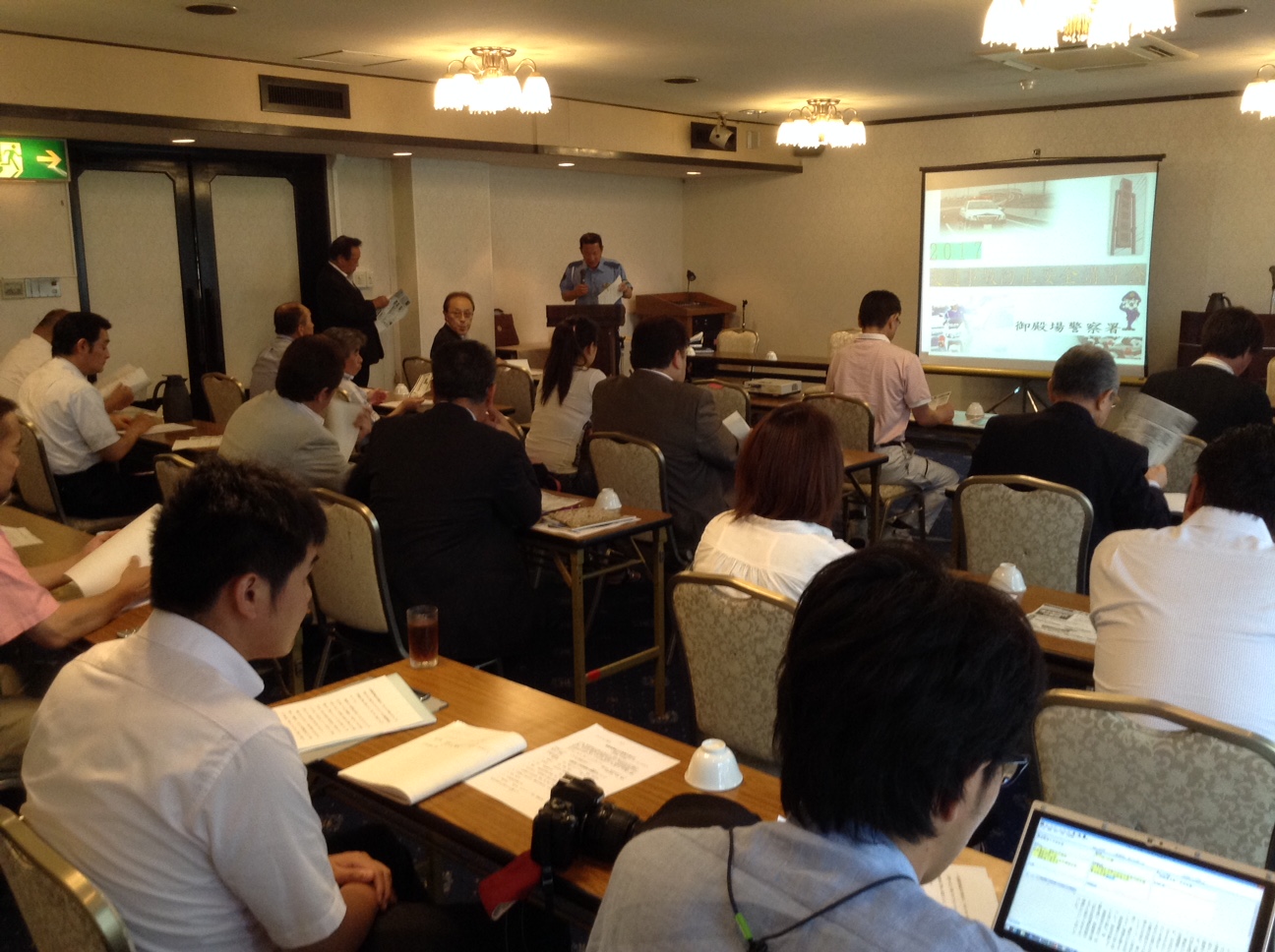 記念講演として、清水 能弘御殿場警察署交通課係長から、静岡県及び御殿場市においての交通事故状況及び実際の事故発生現場においての注意・予備知識のほか、代行業務中に起こりうる事故回避へのアドバイス等がスクリーン表示を交えて講演されました。