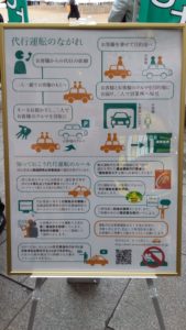 多くの人が行き交うオリオンスクエアの出入口になるオリオン通り側に「カクテルの街宇都宮」とラッピングされた随伴用自動車を展示し人目を引き、その横に「代行運転のながれ」が分かりやすく描かれたポスターをパネルにして展示。近づいてきた人々に代行車の利用方法又、違法行為についての説明を行いました。