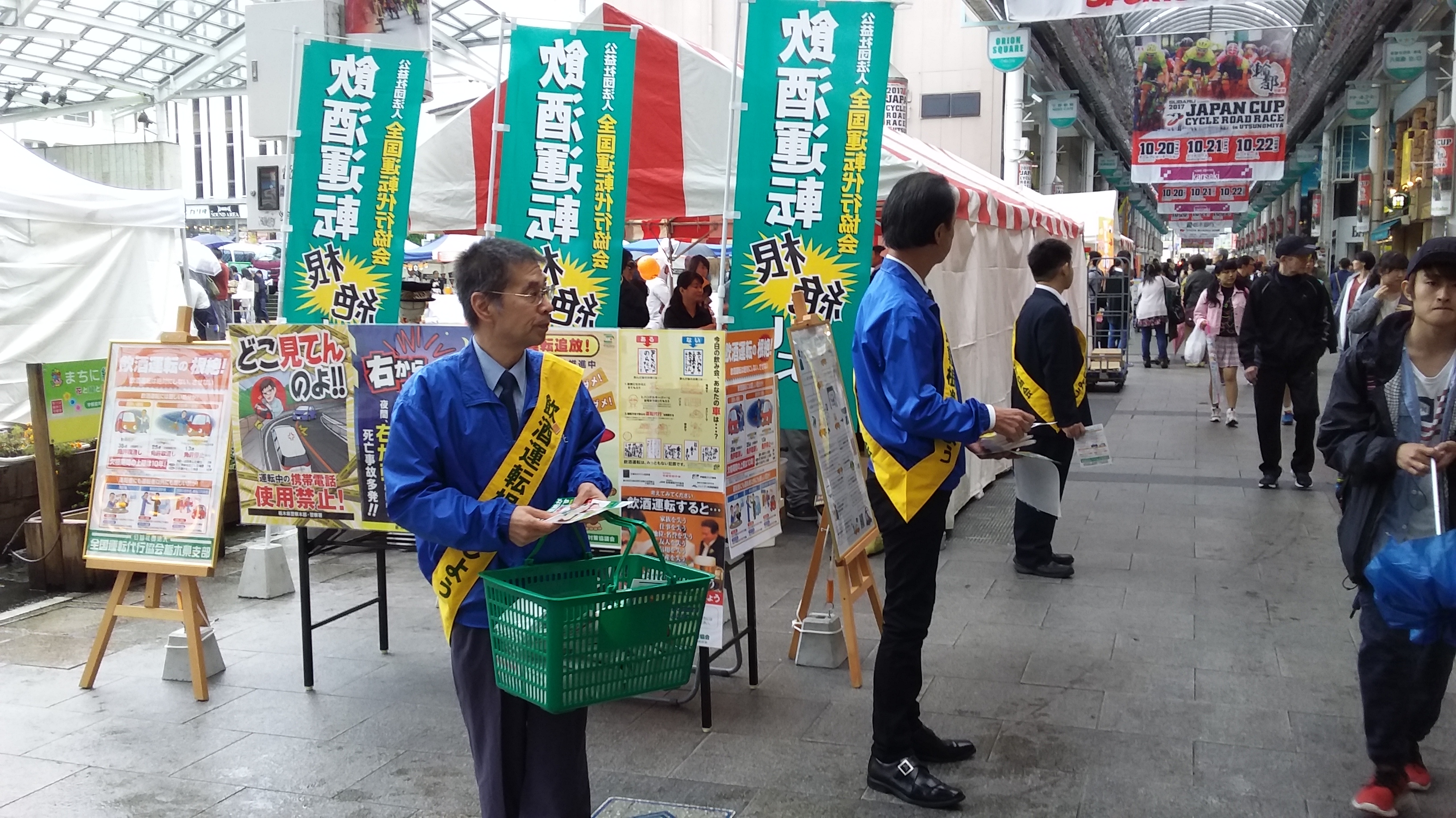 6時間と長い時間の活動であり、又、夜にかけて行っていた事もあり、終盤には宇都宮カクテル倶楽部代表幹事 上杉晴教様(BAR FAKEオーナーバーテンダー)と司会の菊地雄二様(夢酒OGAWA パイプのけむりチーフバーテンダー)お二人がステージから、「私達バーテンダーにとっては、大変ありがたい事です。皆さん お酒を飲んだら代行車で帰りましょう!」と呼びかけて頂きました。また、イベント開始から終了まで、黄色いたすきをつけた協会会員による交通事故防止活動が行われました。
