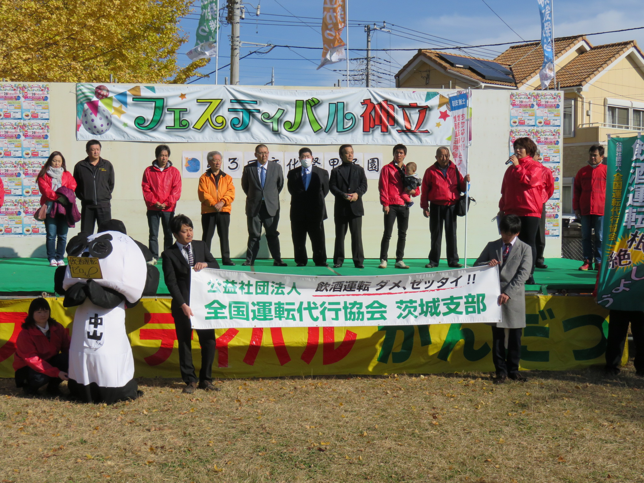 舞台上では、中山支部長はじめ、参加業者の代表たちが、これからの忘年会シーズンに向けて、「お酒を飲んだら必ず運転代行を!飲酒運転ワーストである茨城県から飲酒運転を根絶しよう!」と力強く訴えかけました。