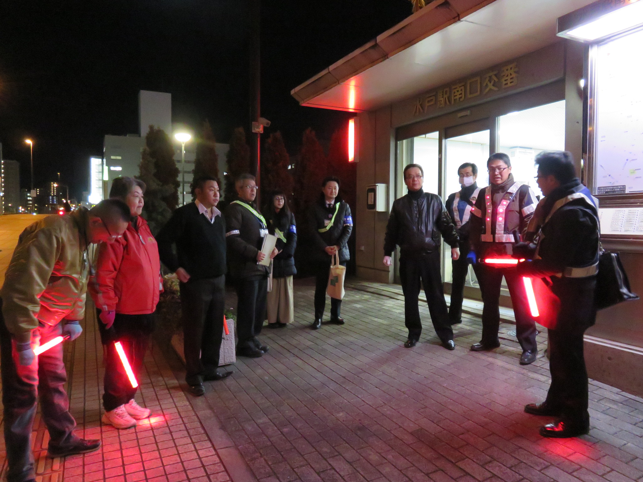 茨城県企画部交通政策課から3名、茨城県警察本部交通総務課から2名、水戸警察署から5名、運転代行業健全化推進員9名が参加し、約1時間にわたり水戸駅南口を中心にパトロールが行われました。