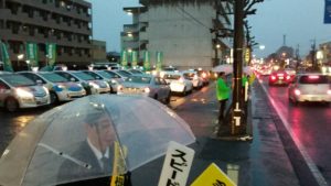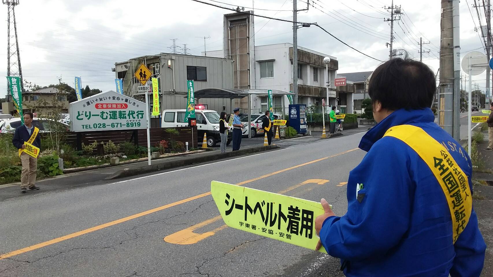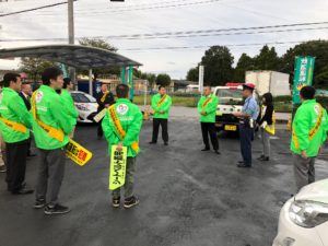 (第二弾)9月27日(木)PM4:30~PM6:00宇都宮市白沢町(どりーむ運転代行駐車場)において宇都宮市東警察署員同行のもと、隣接幹線道路沿いに当協会のぼり旗を揚げ、全員がタスキをかけて交通安全運動の活動を行いました。この場所は、近くに保育園等がある為「全国重点」になっている「子どもと高齢者の安全な通行の確保と、高齢運転者の交通事故防止」に力を入れ、お子様をお迎えに来た親御さんや歩行者の方々にポケットティッシュ・チラシを配布。又、走行中のドライバーには、東警察署からお借りした「運転中の携帯電話禁止・実行しよう 皆に優しい思いやり運転」のハンドボードをかざし注意を呼掛け安全運転の再確認をしてもらいました。