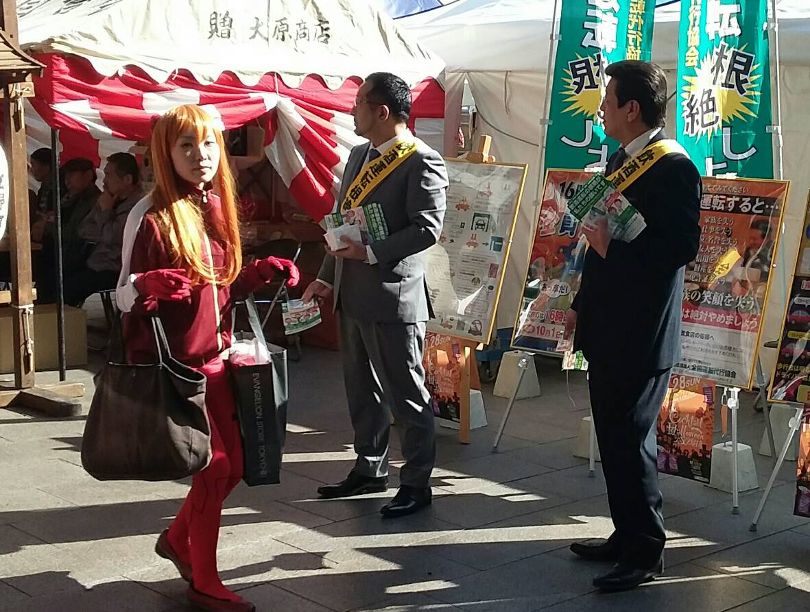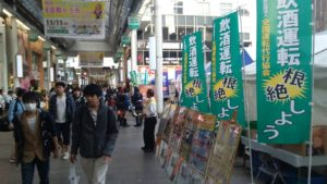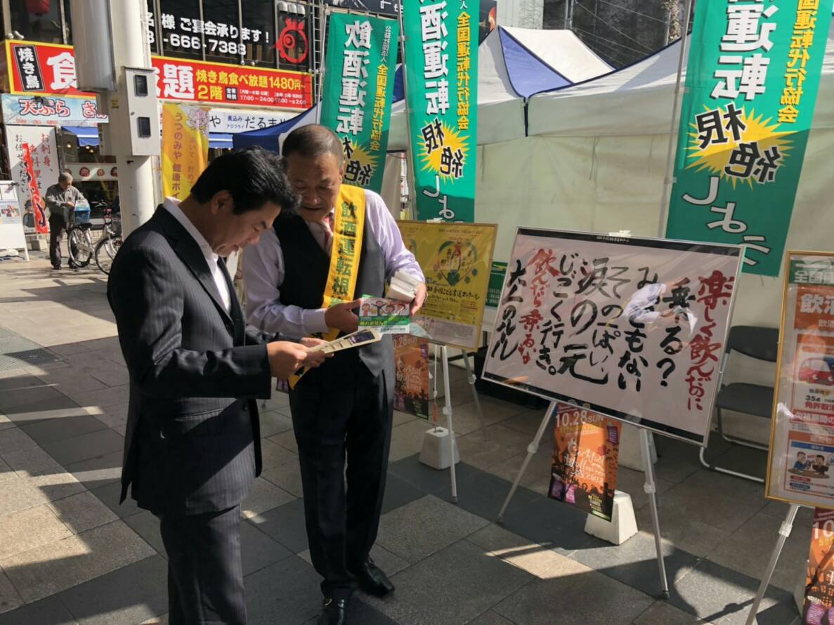 当協会、組合で用意したチラシ・ポケットティッシュ及び宇都宮中央警察から頂いた事故防止チラシ等合わせて1500部を配布し、来場者の方々オリオン通りの歩行者の方々に交通事故防止を呼び掛け、特に我々は「飲酒運転根絶の受皿となる業として」飲酒運転撲滅に力を入れ街頭活動を行いました。又、JD共済プレゼンツ(SDD全国こども書道コンクール)の作品を展示し、「社会から飲酒運転がなくなってほしい」と言う、子供達のメッセージも届けました。又、佐藤栄一宇都宮市長にJD共済プレゼンツの説明もしました。多くの人が行き交う、オリオンスクエアの出入口になるオリオン通り側に当協会のぼりを立て・事故防止となるパネル・飲酒運転根絶のパネル・代行運転のながれが分かるパネル等を展示し交通事故防止、運転代行の違法行為に対する説明を実施いたしました。