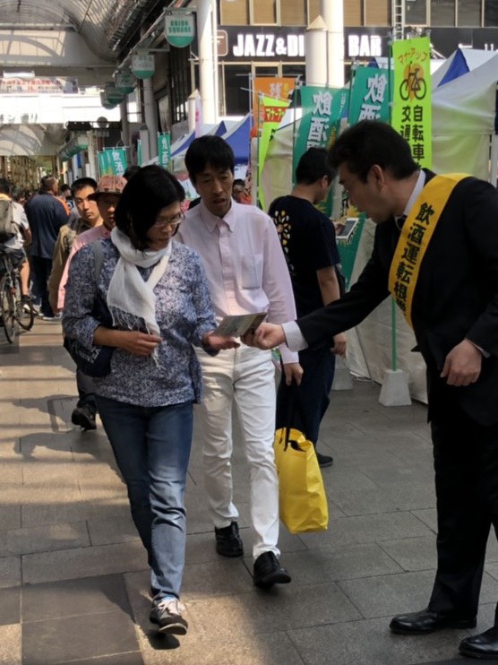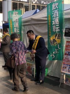 当協会、組合で用意したチラシ・ポケットィッシュ・JD共済から頂いた飲酒運転根絶グッズ及び宇都宮中央警察からいただいた事故防止チラシ等合わせて1500部を配布、来場者の方々オリオン通りの歩行者の方々に交通事故防止の呼び掛けに加え、特に「飲酒運転根絶の受皿となる業として」飲酒運転撲滅に力を入れ街頭活動を行いました。又、JD共済プレゼンツ(SDD全国こども書道コンクール)の作品を展示し、「社会から飲酒運転がなくなってほしい」と言う、子ども達のメッセージも届けました。多くの人が行き交う、オリオンスクエアの出入口になるオリオン通り側に当協会のぼりを立て・事故防止となるパネル・飲酒運転根絶のパネル・代行運転のシステムが分かるパネル等を展示し交通事故防止、運転代行の違法行為に対する説明を実施いたしました。