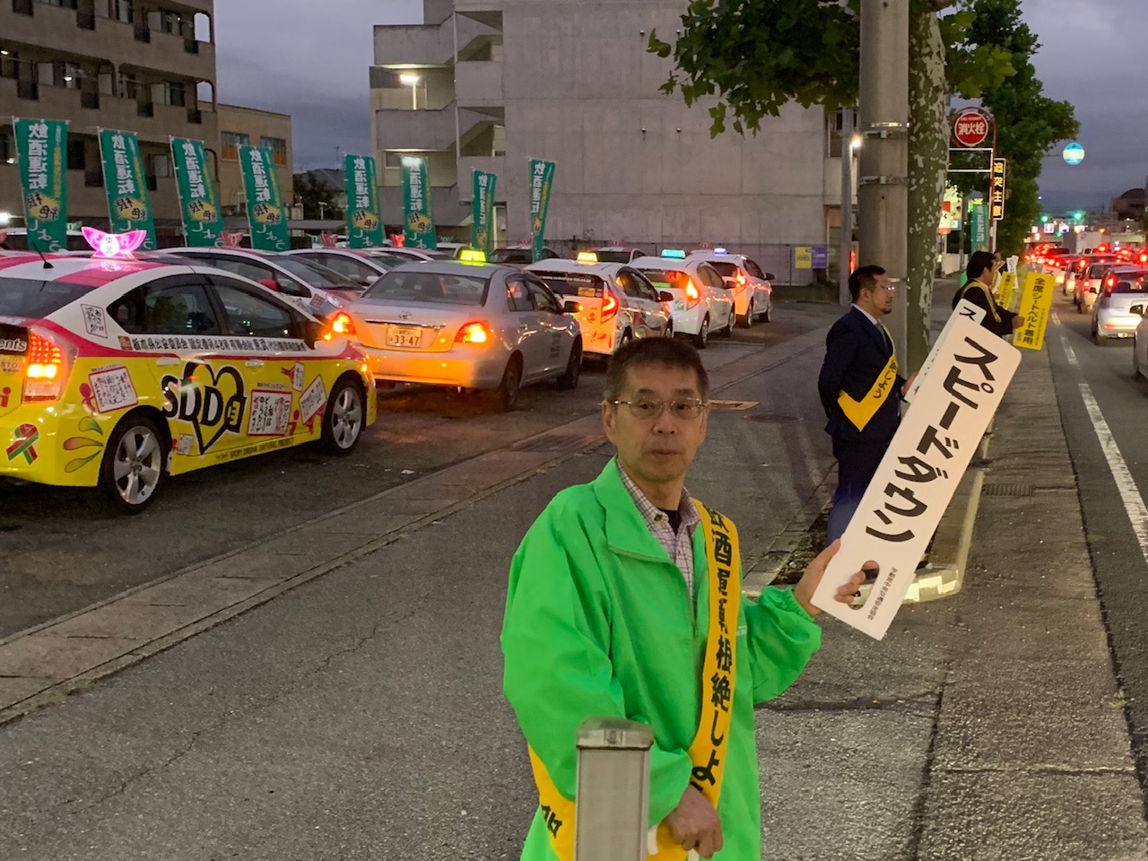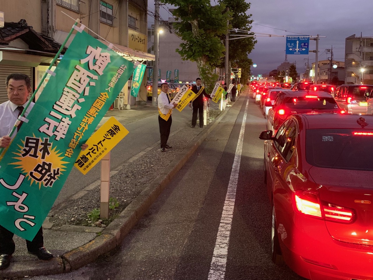 協会栃木県支部(板橋支部長)は、栃木県自動車運転代行サービス業協同組合と連携し「秋の全国交通安全運動」を9月24日(火)PM4:30~PM6:00宇都宮市鶴田町(東武代行)におきまして隣接幹線道路沿いで当協会のぼり旗を揚げ、全員がタスキをかけて交通安全運動の活動を行いました。又、スピードを出しやすい幹線道路の為「栃木県交通安全対策協議会」からいただいた全国重点及び栃木県重点のテーマが記載されたチラシと当協会のポケットティッシュ等とともに安全運転を呼びかけました。また、走行中のドライバーには、宇都宮中央警察署からお借りした「スピードダウン・全席シートベルト」のハンドボードをかざし注意を呼掛け、安全運転の再確認を伝えました。
