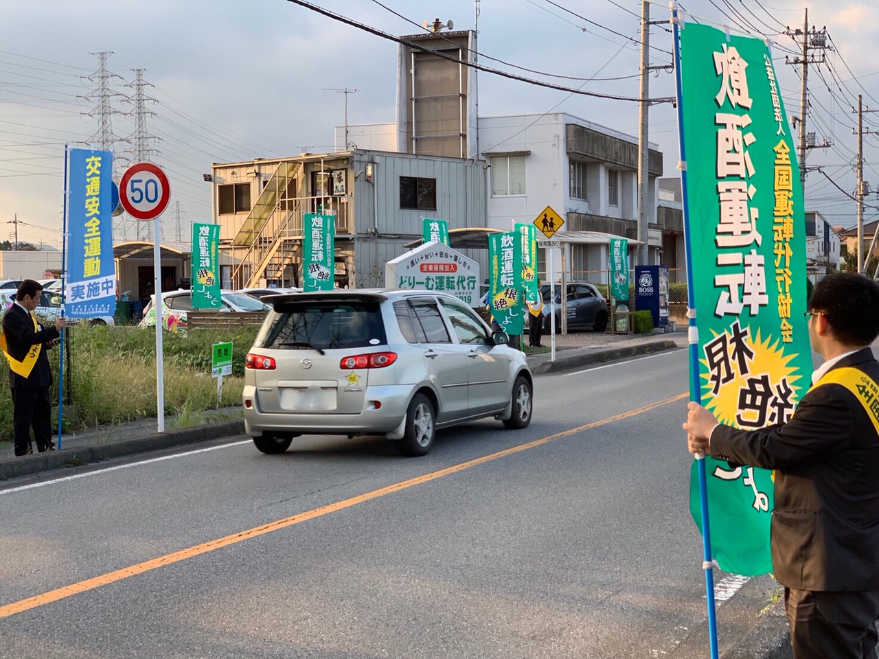 (第二弾)9月26日(木)PM4:30~PM6:00宇都宮市白沢町(どりーむ運転代行)において、隣接幹線道路沿いに当協会ののぼり旗を揚げ、24日同様に交通安全運動の活動を行いました。