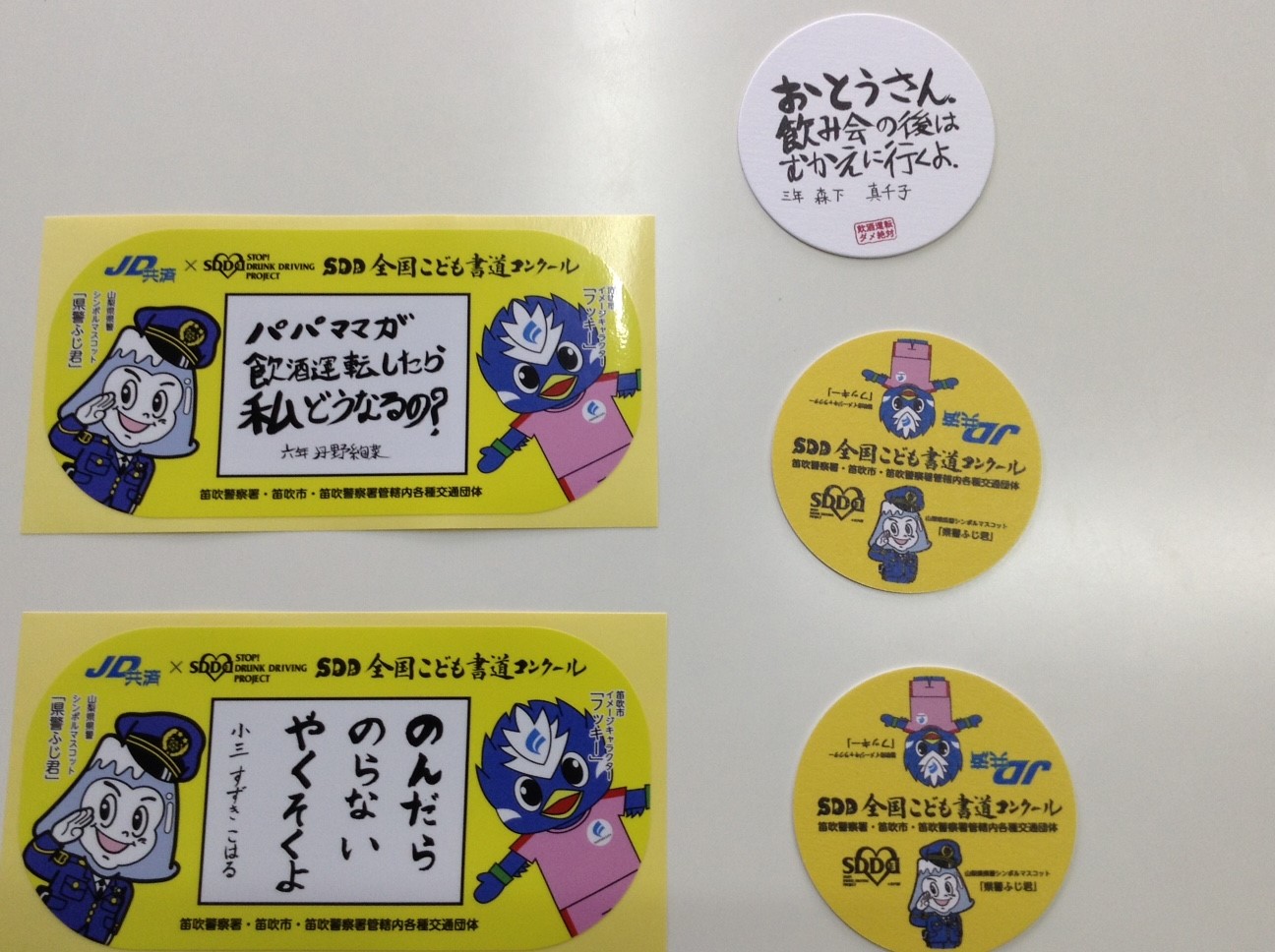 このステッカーは、ジェイ・ディ共済協同組合が実施している「SDD全国こども書道コンクール」に応募された作品群の中から選定された、子供たちから飲酒運転を止めない大人たちへのメッセージを伝える活動です。