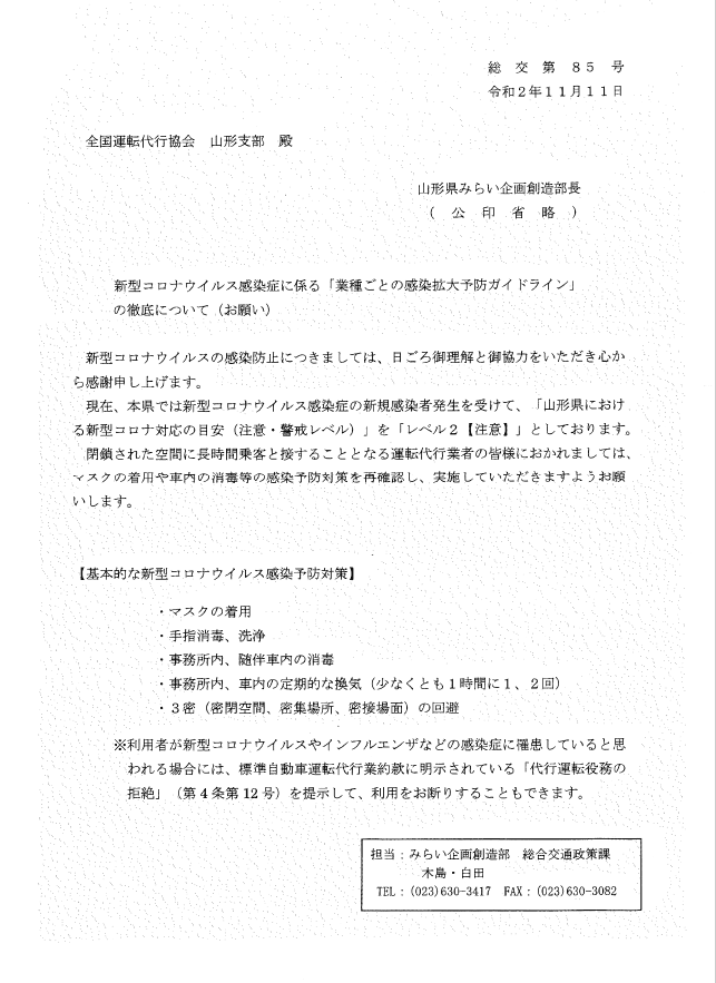 【山形県内の事業者の皆様】感染予防対策ガイドライン徹底のお願い » 公益社団法人 全国運転代行協会