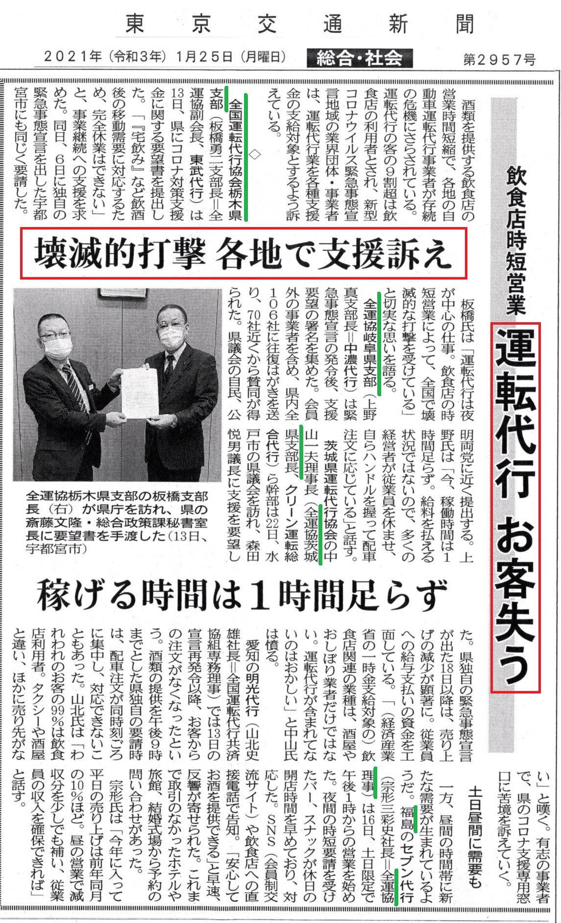 コロナ禍における協会各支部の活動や近況が東京交通新聞にて報道されました。コロナ禍においても、運転代行業界の為奮闘する各地の様子をご確認いただけます。