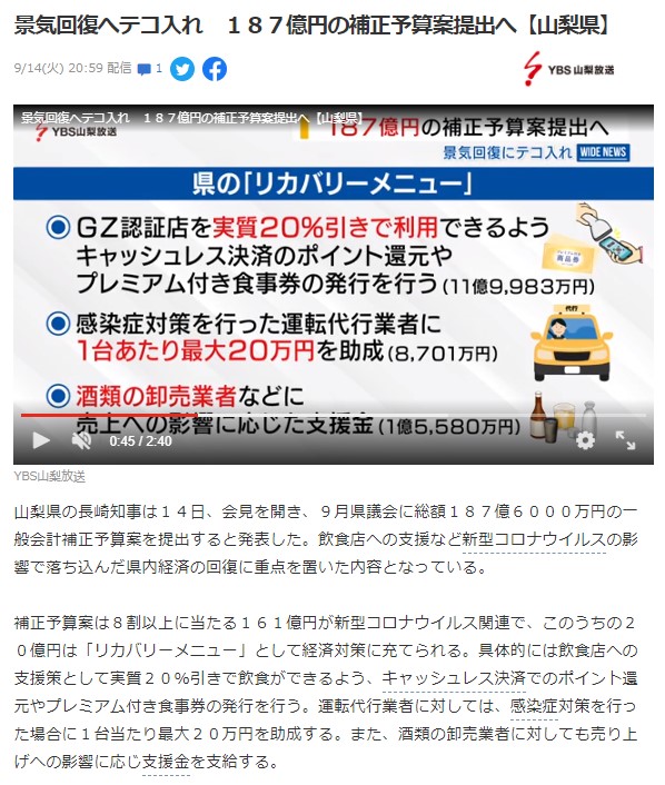 山梨県は、9月県議会に一般会計補正予算案を提出すると発表。新型コロナウイルスの影響による経済回復に重点を置いた内容となっており、運転代行業者に対しては、感染症対策を行った場合に1台当たり最大20万円を助成する。