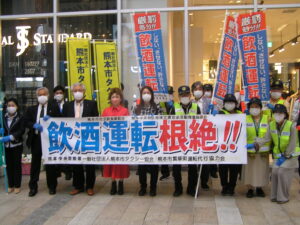 (公社)全国運転代行協会 熊本県支部(支部長 小森田政憲)は、春の全国交通安全運動期間中の4月15日、熊本市内の下通アーケード街にて飲酒運転根絶のための街頭活動を実施しました。熊本中央警察署のご協力のもと、歩行者へポケットティッシュ等を配布し、飲酒運転根絶を訴えました。