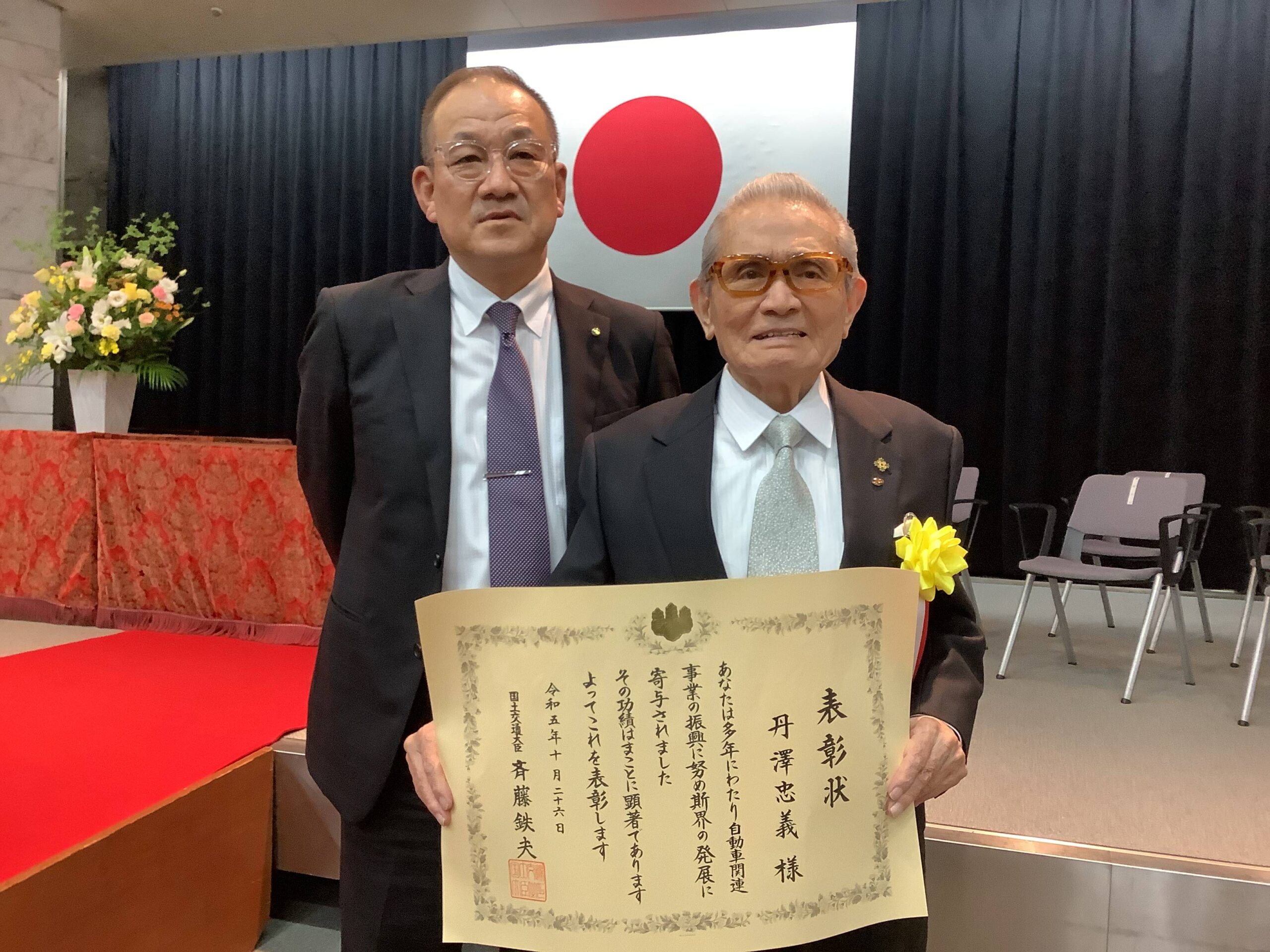 令和5年10月26日(木)国土交通省大会議室に於いて、「令和5年度自動車関係功労者大臣表彰式」が開催され、当協会の丹澤忠義前会長(現当協会顧問)が表彰されました。