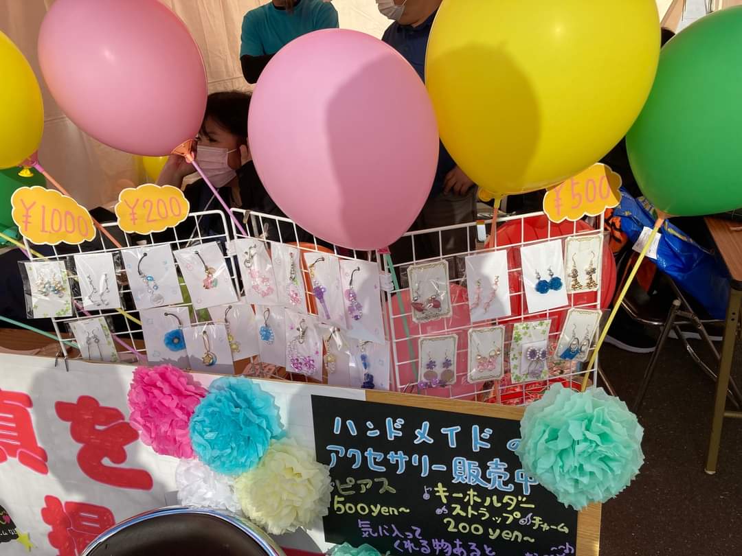 ハンドメイドアクセサリーは、協会加盟員の娘さんがピアス、ストラップ、髪留めなど可愛らしい作品を店頭にならべ、販売させて頂きました。商品の出来栄えに感心し、子供から大人まで、いろいろな方に買って頂きました。