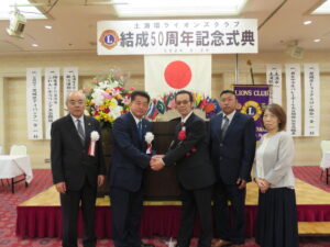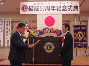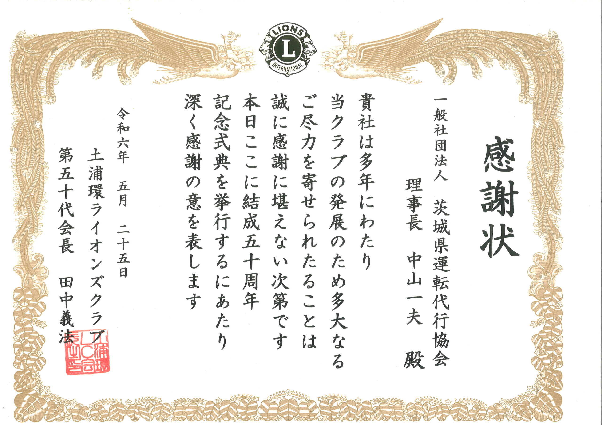 令和6年5月25日(土)、ホテルマロウド筑波にて、土浦環ライオンズクラブ50周年記念式典が挙行されました。その中 で、(公社)全国運転代行協会茨城県支部長並びに(一社)茨城県運転代行協会 中山一夫理事長が、飲酒運転根絶・交通安全活動・障害者とのふれあいボウリング大会賞品寄贈等、日ごろからの長年にわたる活動が評価され、土浦環ライオンズクラブ第50代田中義法会長より、表彰され感謝状が授与されました。