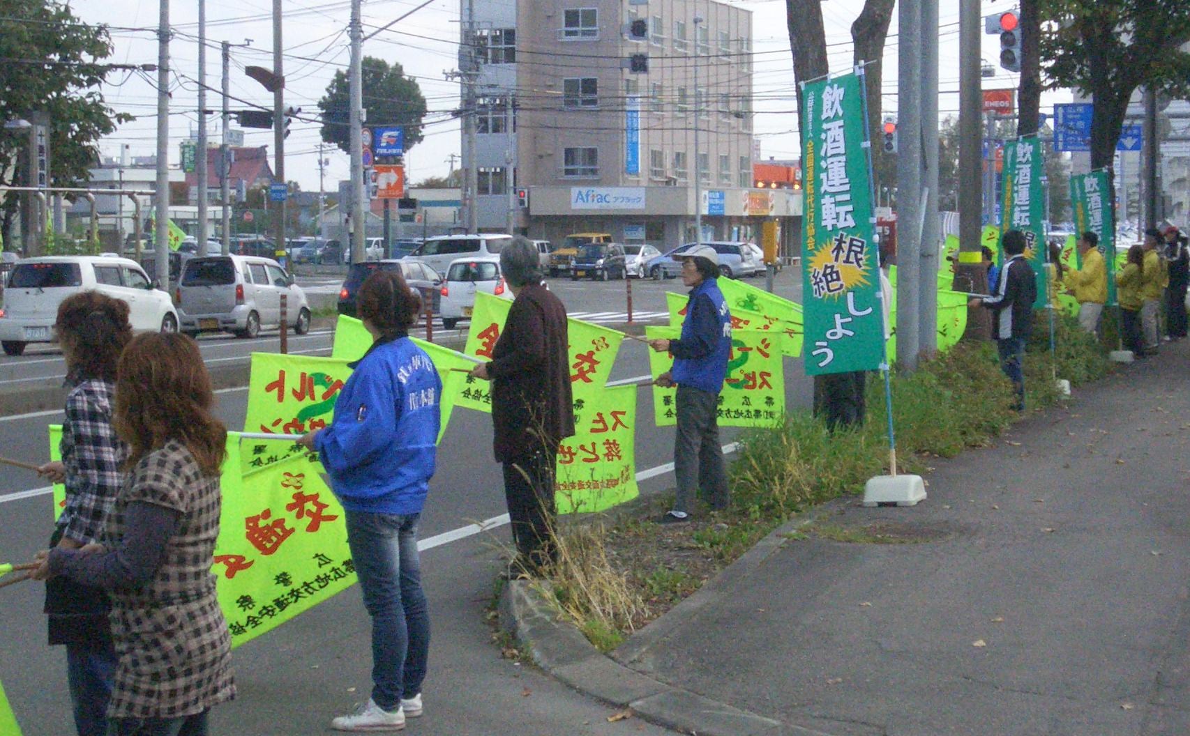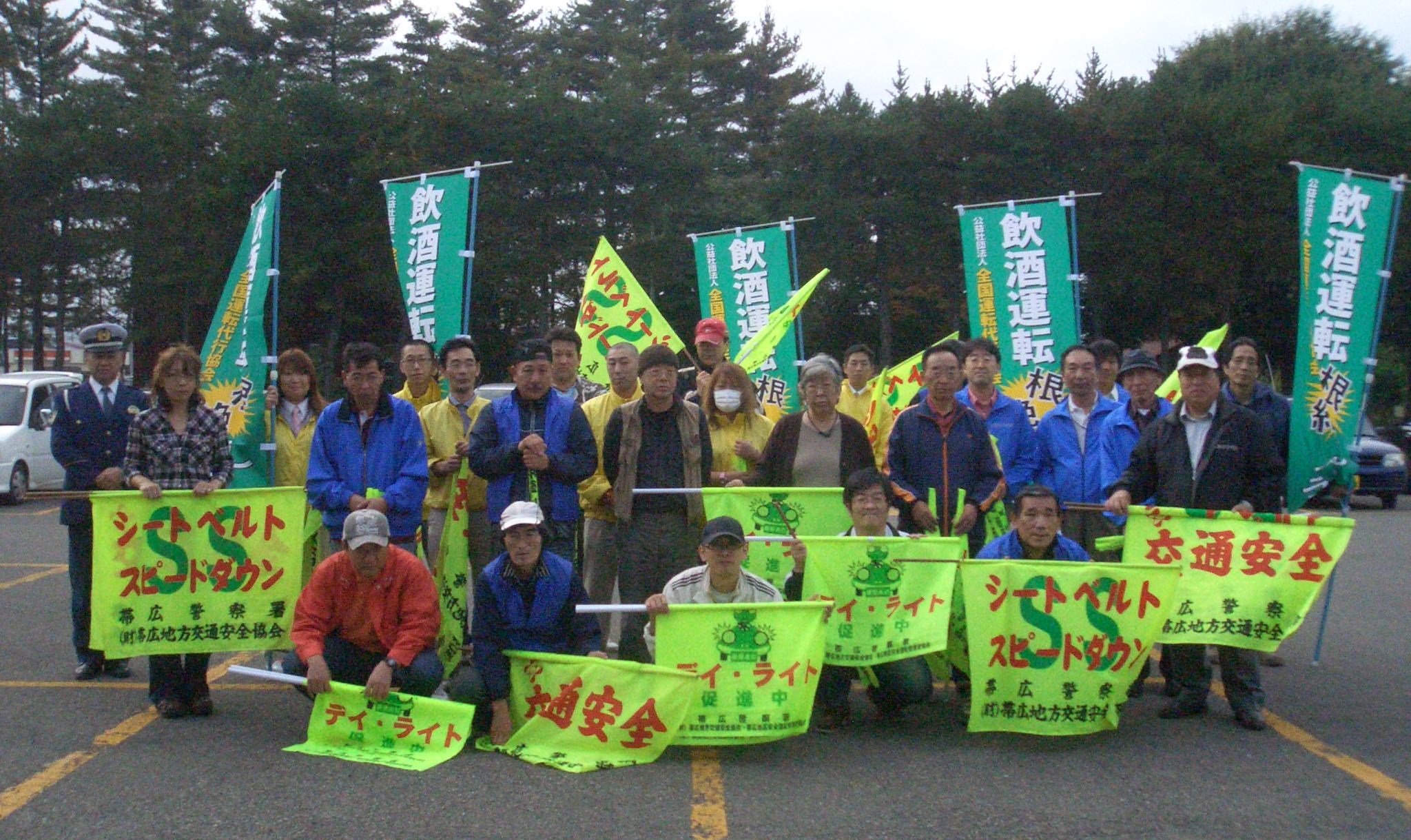 協会北海道支部では、平成25年10月7日(月)、十勝地方運転代行連合会と共催で「『交通安全・飲酒運転根絶』旗の波作戦」を実施しました。当日は会員事業者8社、代行連会員業者4社の総勢31名が午後1時に帯広市総合体育館駐車場に集合、栗原十勝地方運転代行連合会会長と帯広警察署交通企画課佐藤係長の挨拶をいただいてから、国道241号線歩道上の約40メートル間で通行車両に向けて『交通安全・飲酒運転根絶』を訴えました。